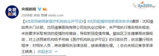 沈阳疫情防控新闻发布会通报:沈阳皇姑秀水门诊部、沈阳谱康医院有限公司在执业过程中,未严格执行落实相关规定、未按要求采取有效的疫情防控措施,导致新冠疫情传播。皇姑区卫生健康局依据规定,对上述两家机构给予吊销《医疗机构执业许可证》的行政处罚,依法履行相关程序;对相关人员,将依据相关法律法规,继续调查处理。(总台央视记者李承泽 王晓亮)