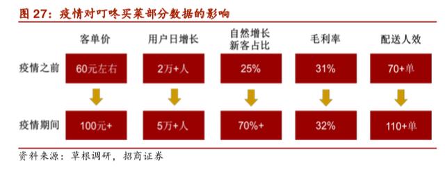 囤货需求明显,叮咚买菜客单价大幅提升,由60元提升至100元+。主要因为疫情期间用户的囤货需求增加。