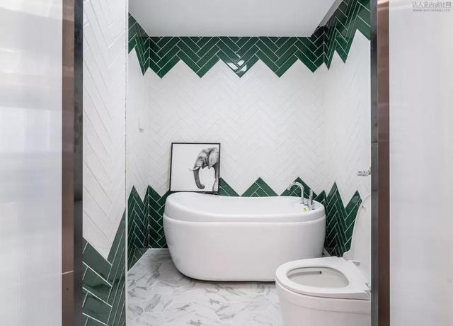 洗浴空间设计感也非常强,洗手台单独放在走道,整体利用绿色和白色打造浪漫氛围,卫浴墙地面都非常有借鉴价值。
