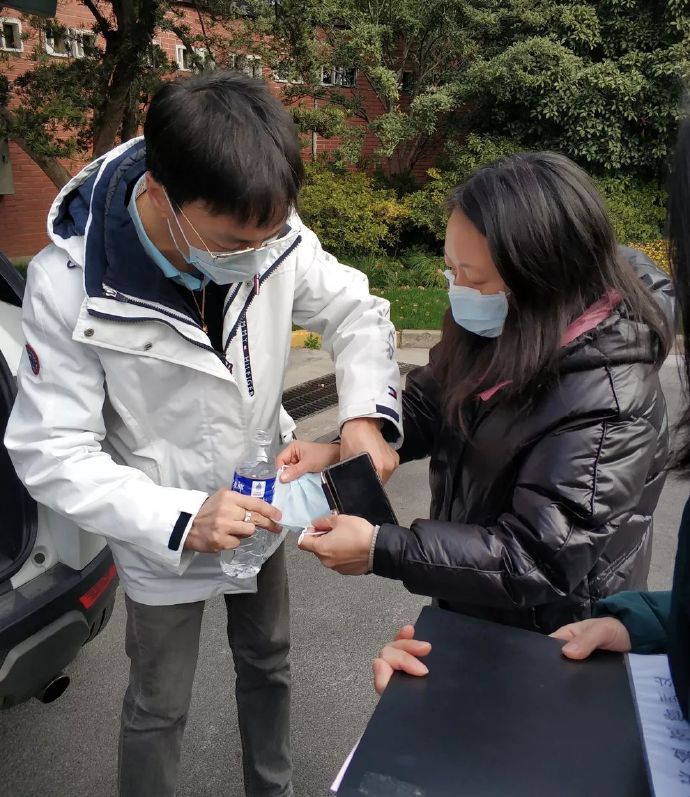 2月19日上午,在复旦大学疫情防控工作的关键阶段,陆章基、陆云刚校友父子特地驾车回到复旦,为母校送上一份大礼——购自俄罗斯的两箱共计5000个医用一次性口罩。资产管理处老师代表学校接受物资,对外联络与发展处、退休教职工工作处老师共同见证。