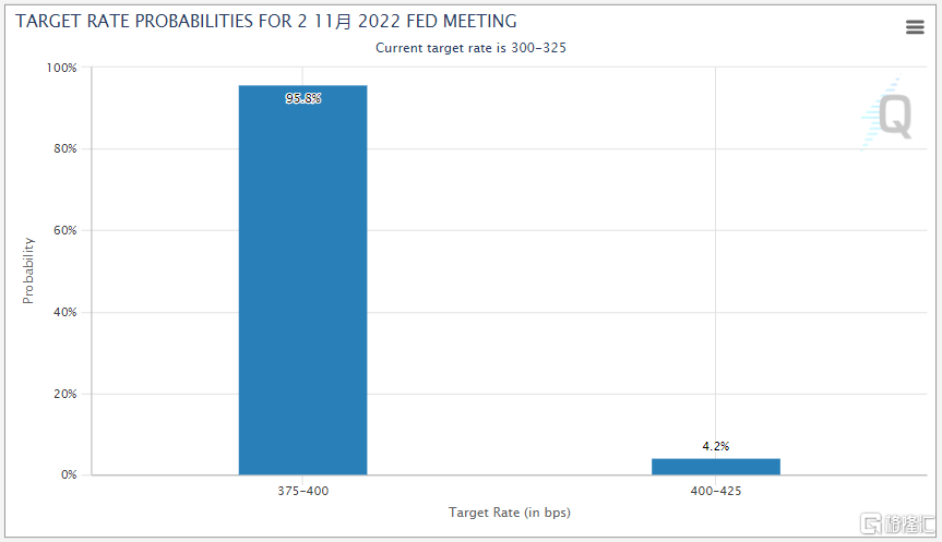 目前美联储11月连续第四次加息75基点的概率已经升至95.8%。