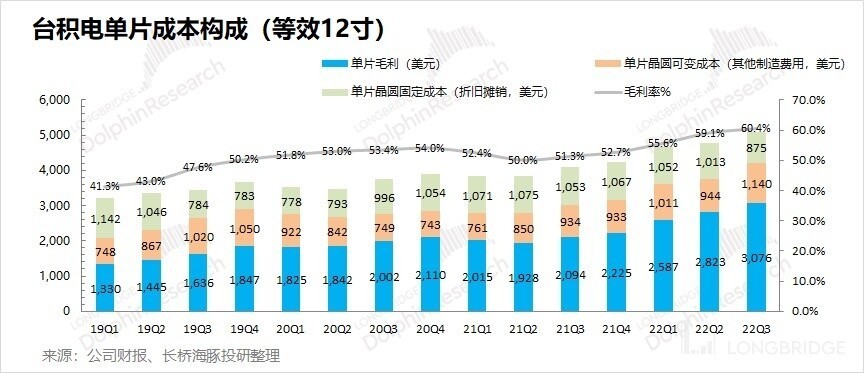 台积电在 2022 年第三季度实现毛利 122.2 亿美元,环比增长 14%。环比增速高于收入增速(11.4%)的原因,主要在于毛利率的超预期提升。其中三季度台积电的毛利率 60.4%,超指引区间上限(57.5-59.5%)。