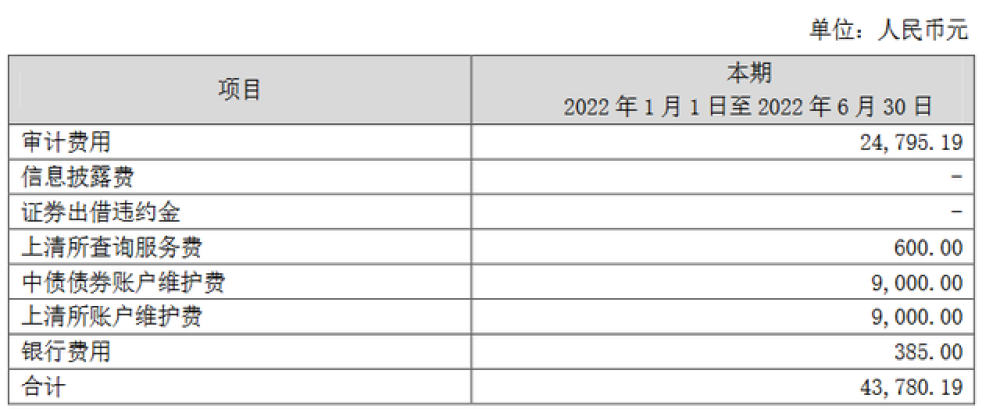 从披露比较详细的2022年中报中,我们看到,其他费用包括审计费、查询服务费、账户维护费等。这些费用在2022奶奶上半年合计达43780.19元。