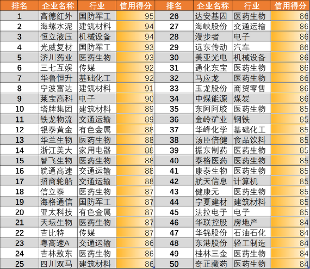 高德红外、海螺水泥及恒立液压占据信用评分榜前三位。行业层面看,钢铁、煤炭及交运等国有企业占比高的行业,信用评分较高。生物医药公司分化比较强,前50名中占比高,但是评分低的企业也不少,导致整体行业并没有挤进前十。