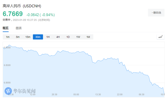 1月9日周一,上午在岸、离岸人民币兑美元汇率双双收复6.8关口。午后人民币持续拉升,离岸人民币兑美元升破6.77关口,日内涨超600点。在岸人民币兑美元涨超600点,报6.7611。