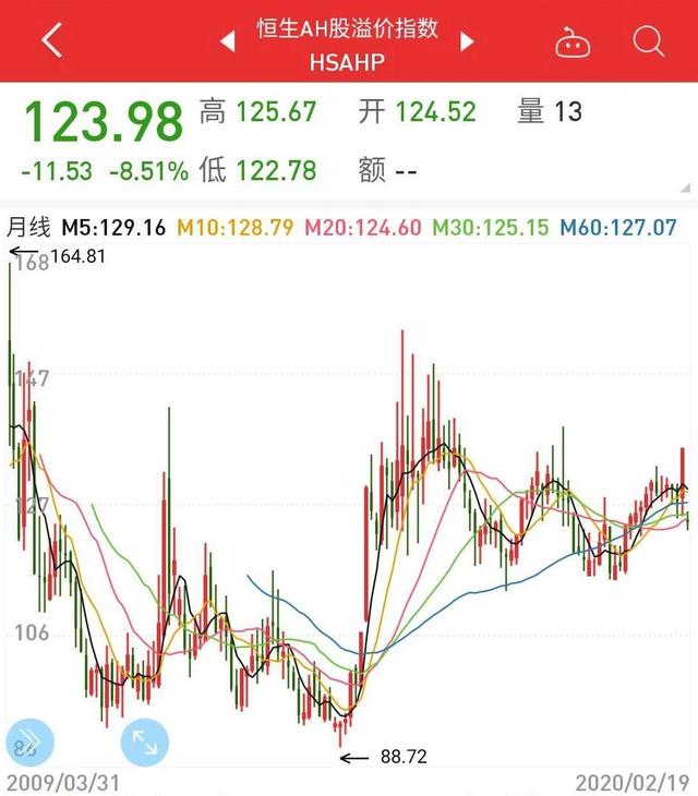 当溢价指数低于120时,A股的投资价值高于港股,低于110时,则A股投资价值巨大;