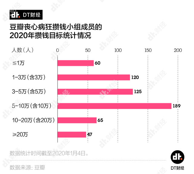在这样共同鞭策、全员致富的氛围下,组内还发起了2020年攒钱目标的FLAG大会。作为存款还达不到小组人均水平的后进青年,DT君斗胆点进去瞅了瞅,顺便统计了下在野理财专家们2020年的攒钱目标。