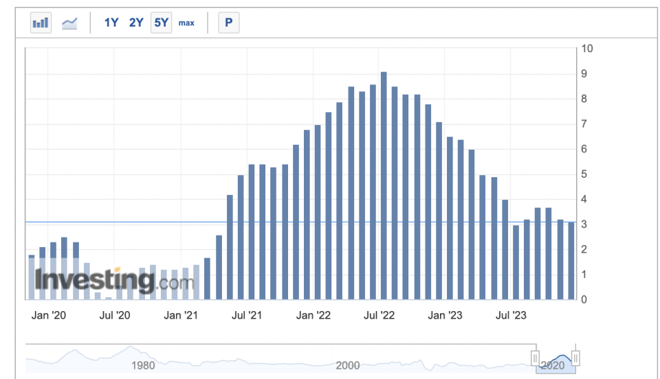 根据美国劳工统计局公布的最新公布的数据显示,作为衡量通胀的主要指标之一,美国11月CPI同比上涨3.1%,较10月的3.2%放缓,符合预期。此外,3年期的美国国债收益率跌至6个多月以来的最低水平至4.128%,7年期的国债收益率跌至3.931%,10年期的国债收益率跌至3.9%,均为今年7月底以来的最低水平。