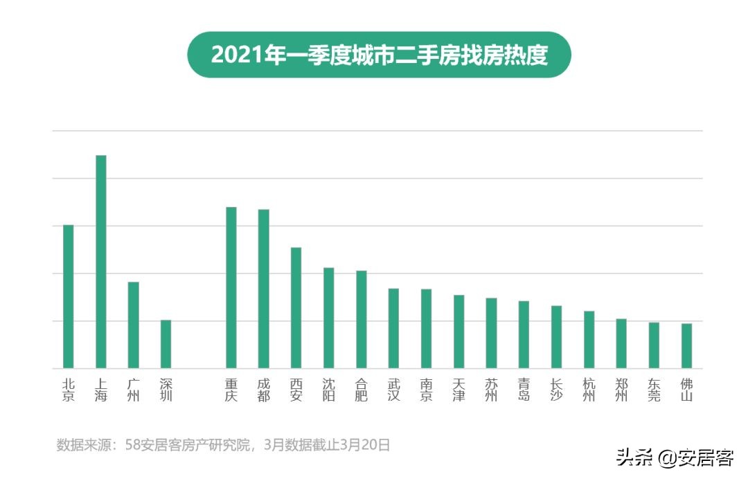 统计数据显示,2021年3月为二手房找房高峰,同比来看,1月、2月二手房的访问热度均有明显上涨。一季度,上海、北京二手房找房热度同比涨幅均超过20%;新一线城市中,重庆、成都、西安的二手房找房热度排名前三,除此之外,武汉、合肥找房热度同比涨幅位列前二名。