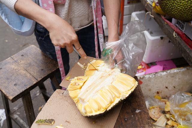 9块钱一斤的波罗蜜肉,买了一袋子,付好钱,卖水果的老板娘指指边上的粉铺,问我们吃没,没吃可以在他们家吃。说这个粉铺是几个月前开的,水果卖的好了,就想多做点生意。我们看看她背上布兜里睡着的小朋友,违心的说下次再来吃。