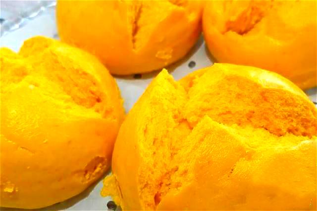 第6步,时间到后取出小碗,稍微放凉后,倒扣脱模,香甜松软的南瓜开花馒头就做好了。