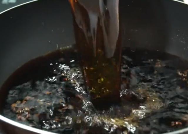 3,八角和花椒的香味,加入500克的生抽,500克的陈醋,40克的冰糖,勤快的搅拌一下使冰糖融化,把料汁熬开以后关火自然晾凉