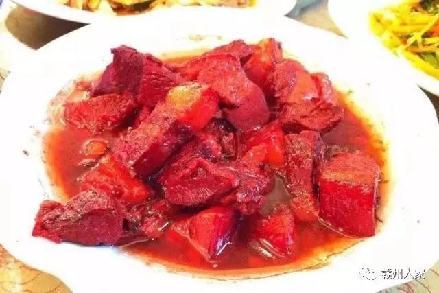 赣州兴国人喜爱红色,春节期间的红烧肉加入红曲(洋红)做成红色的,色泽十分鲜艳。当然,还有红鱼啦,做法一样,是将鱼加入红曲。