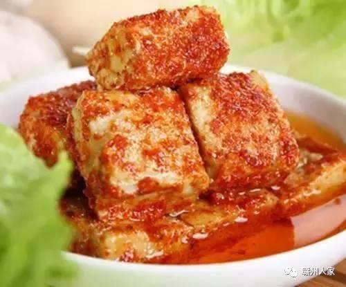 酿豆腐,赣州的是用油豆腐,先把水豆腐进行油炸而成,而且是要三角形的,反面塞肉,一般是和粉笼床一起蒸。