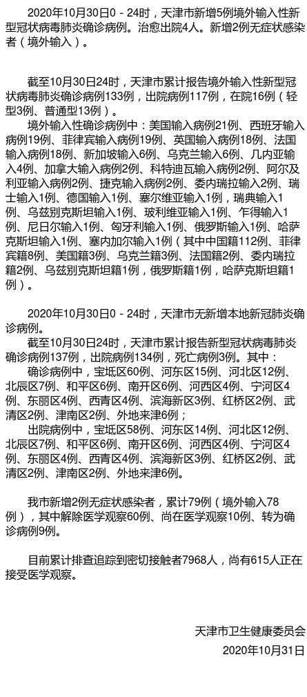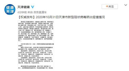 2020年10月31日天津市新型冠状病毒肺炎疫情情况
