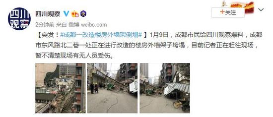 1月9日,成都市民给四川观察爆料,成都市东风路北二巷一处正在进行改造的楼房外墙架子垮塌,目前记者正在赶往现场,暂不清楚现场有无人员受伤。