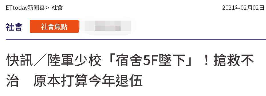 报道介绍说,苏姓少校现年43岁,在台湾陆军第三地区支持指挥部台北甲型联合保修厂服役,原本打算今年退伍,然而却发生坠楼意外。至于详细死因,仍有待调查厘清。
