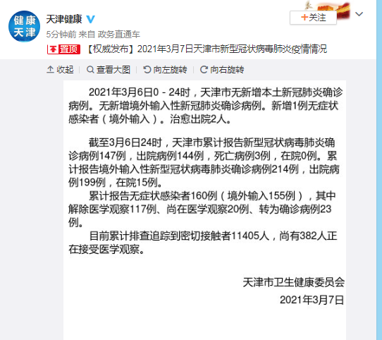 2021年3月7日天津市新型冠状病毒肺炎疫情情况