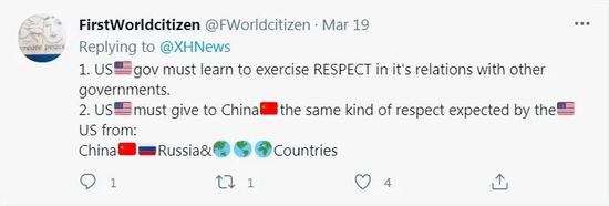 名为“FirstWorldcitizen”的网友在推特上回复说:“一,美国政府必须学会尊重其他国家的政府 ;二,美国在要求中俄等国给予尊重的同时,也必须报之以相同的尊重 。”