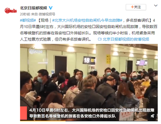 4月10日早晨6时左右,大兴国际机场的安检口因安检自助闸机出现故障,导致数百名等候登机的旅客在各安检口外排起长队。现场等候约半小时后,机场紧急采用人工检票方式验票,但仍有多名旅客误机。
