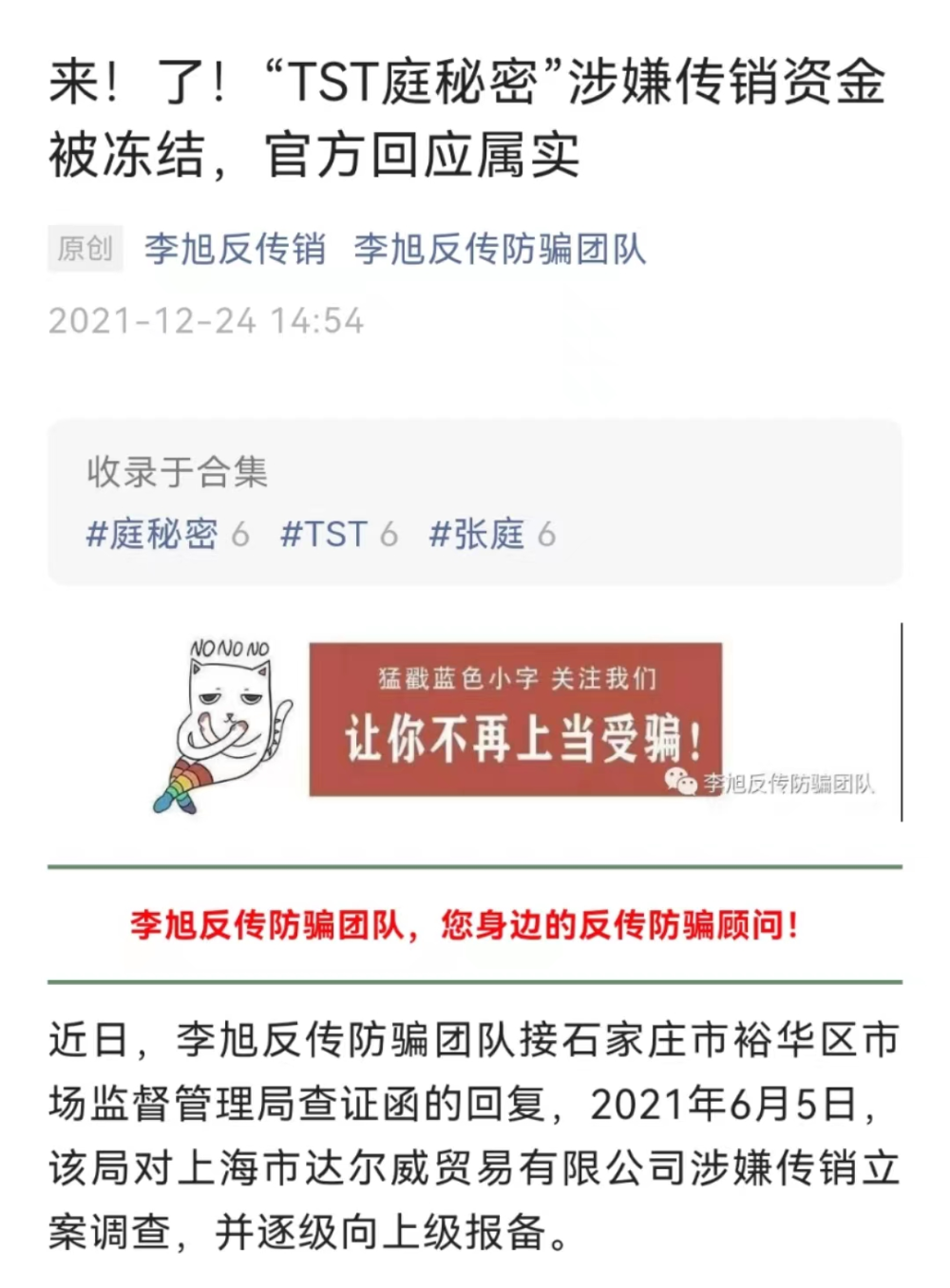这场舆论风暴起源于公众号“李旭反传防骗团队”发表的一篇文章《来!了!“TST庭秘密”涉嫌传销资金被冻结,官方回应属实》。