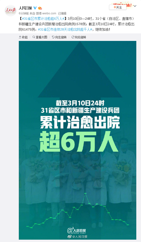 3月10日0—24时,31个省(自治区、直辖市)和新疆生产建设兵团新增治愈出院病例1578例;截至3月10日24时,累计治愈出院61475例。31省区市连续28天治愈出院超千人,继续加油!