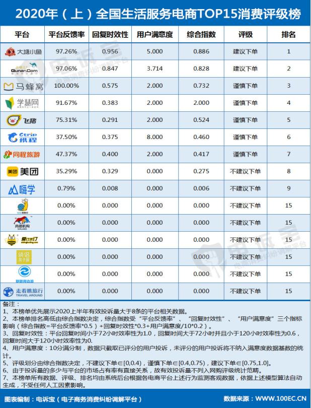 今年央视315晚会落幕,嗨学网、趣头条等被互联网公司被点名。7月16日晚间,国内无名电商智库网经社电子商务研究核心发布了《2020年(上)中国电子商务用户体验和赞叹监测呈报》(呈文PPT全文下载://www.100ec.cn/zt/2020yhtsbg/)。呈文颁布发表了《2020年(上)糊口做事电商TOP15消费评级榜》、《2020年(上)在线旅游TOP10消费评级榜》、《2020年(上)在线教训TOP05消费评级榜》消费评级榜,涉及在线旅游、在线辅导等畛域,报告还宣布上半年八大电商消费称道典型案例。