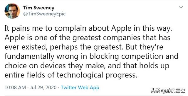 今日,Epic开创人Tim Sweeney再次发推吐槽苹果。