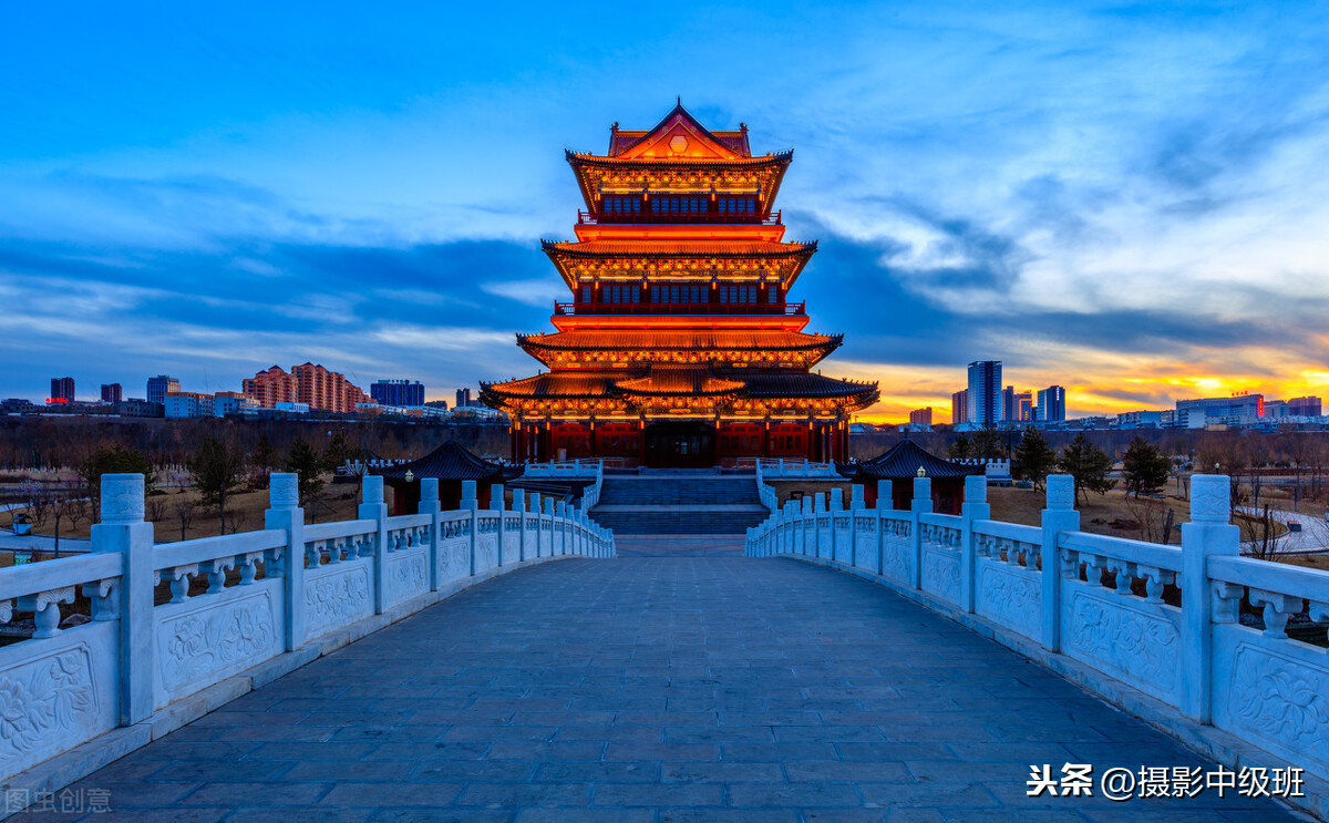下面这张照片(图十一),天空是蓝色的、前景是蓝色的,画面的基调是冷色的,而主体古塔却被灯光打成红色,暖色的。冷暖对比,具有很强的视觉冲击力。