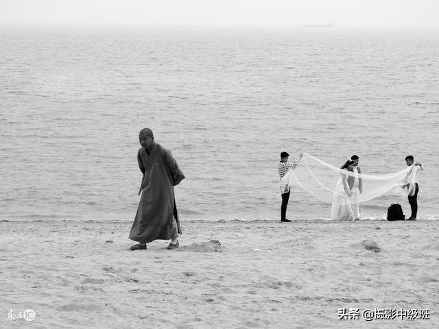 下图(图二十一),海滩上,一对新人正在热火朝天的拍婚纱照;一位大师路过,本想看看海,静静心,没想到遇到这场景。于是,瞟了两眼,心说,“没什么意思,告辞”;随后,掉头悻悻的走了。这是难得一见的热闹与冷清的对比。