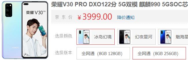 2、荣耀V30 Pro-8+256G-3999元