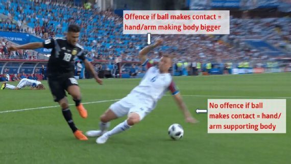 其中的一个示例就是球员为了防止跌倒或者在起身时支撑身体,即使球打手也不会被视为手球犯规。